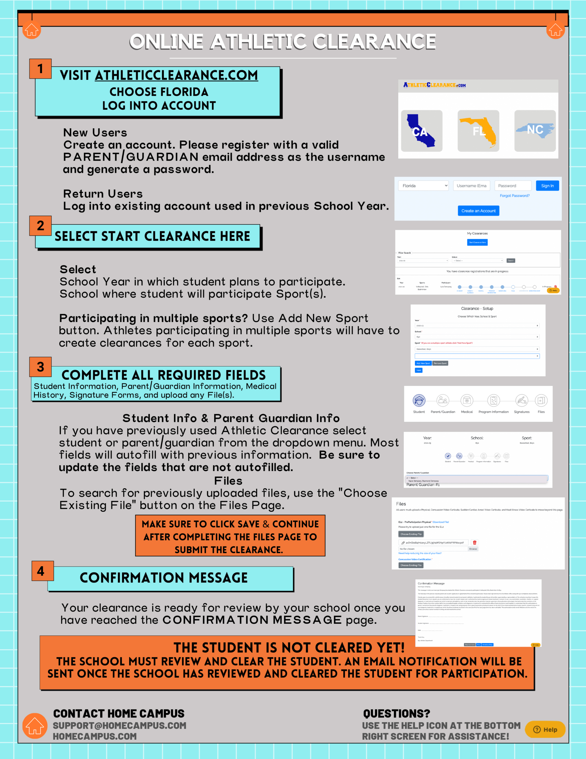 #3. In addition, an online account entitled the ATHLETIC CLEARANCE ACCOUNT must be opened or updated every year. This will include necessary information from the student and the parent to complete including digital signatures for both. Click here for instructions on opening the account. There is a HELP button for assistance and an email for questions or problems. In addition, you may contact Mr. Haynes at khaynes@pensacolachs.org or at 850-436-6400 ext. 623.
